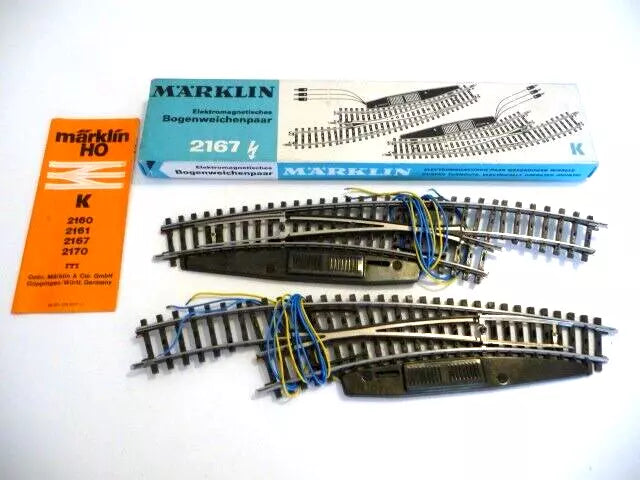 Vous enchérissez sur 1 pair Marklin HO 2167 - K- Aiguillages electrique courbes, dans un bon état, avec la boîte originale. L’Acheteur payer les frais du transport, emballage, manipulation et banque transfert. Poids toute compris : ± 450 gr