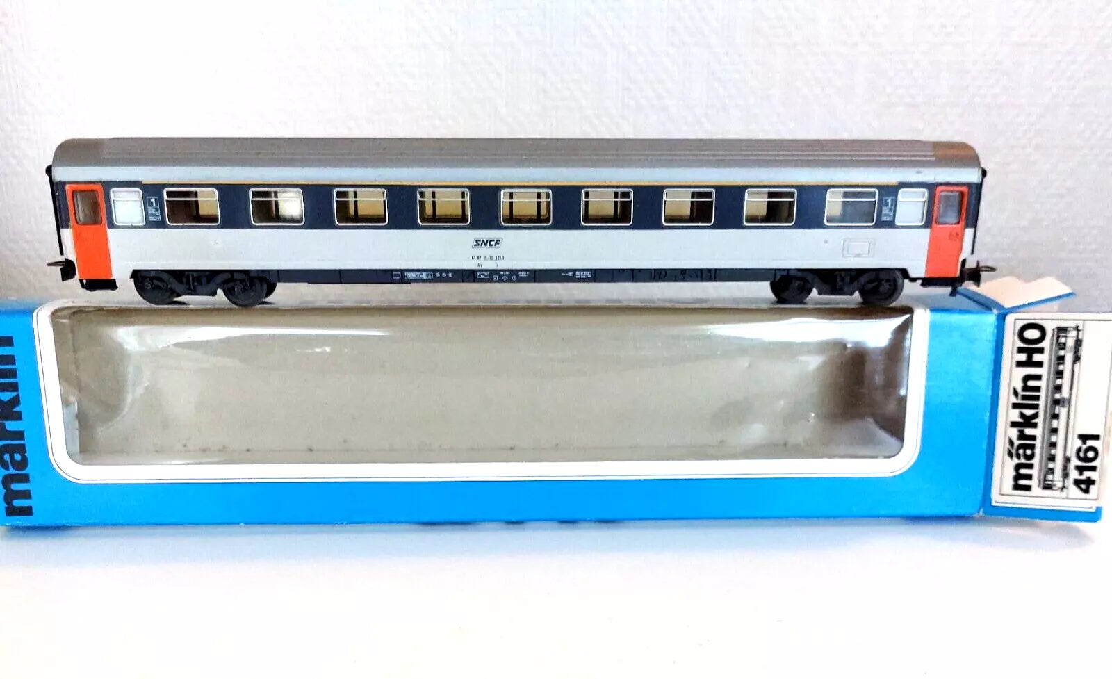 Here is a lot of 1 piece HO Marklin 4161 - French Passenger Eurofima car 1 cl, of the SNCF, in as new condition, with original box. Buyer pay all shipment-, package-, handle-, bank transfert costs. Weight all included : ± 0,450 kg.