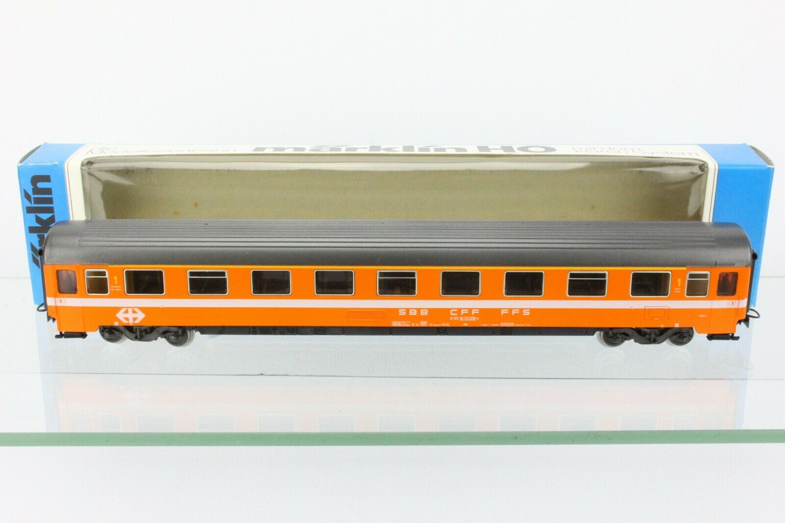 Here 1 piece HO Marklin 4162 – Suisse Eurofima car 1e class, of the SBB/CFF Railroad, in NEW condition, with original box. Buyer pay all shipment-, package-, handle-, bank transfert costs. Weight all included : ± 445 gr.